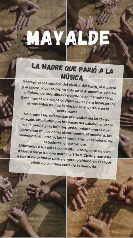 Mayalde no propone un concierto al uso, sino una inmersión en los «viejos códigos orales». El espectáculo busca localizar la esencia del ritmo antes de que la música quedara confinada en el pentagrama. Para ello, los intérpretes —Eusebio, Laura, Arturo y Pilar— exploran las referencias prenatales del latido del corazón y las expanden con sonidos de la naturaleza y la vida cotidiana, como el paso de un caballo o el canto de una perdiz.